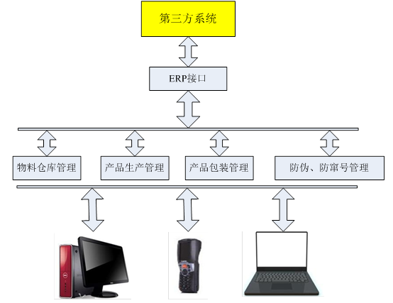 本系統将通過條碼應用來幫助執行層進行事務操作,範圍包括物料倉庫管理(lǐ)、産品生産管理(lǐ)、産品包裝管理(lǐ)、防僞、防竄号管理(lǐ)等。每個模塊都可(kě)以通過數據接口與第三方統進行數據交換,自(zì)動實現業務管理(lǐ)層數據收集、單據錄入等工作。