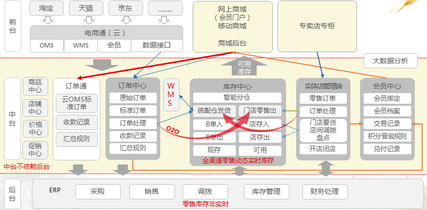 上圖為(wèi)用友打造的(de)線上線下融合模式的(de)框架圖,其中B2C訂單中心是企業能夠實現線上線下訂單融合的(de)關鍵部分。用友在2015年(nián)推出的(de)電商通可(kě)以實時将企業電商平台和(hé)網上商城等數據同步到訂單中心,以實現企業對訂單和(hé)售後的(de)統一(yī)管理(lǐ)。同時,庫存中心和(hé)智能分倉真正将線下門店倉庫等統一(yī)管理(lǐ)起來。