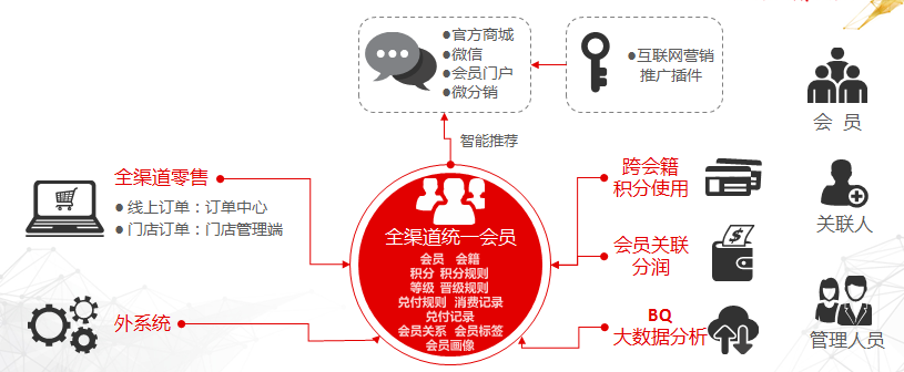 會員的(de)統一(yī)管理(lǐ)是全渠道(dào)營銷的(de)關鍵特性,實現了會員多端入口統一(yī)、線上電商線下零售會員打通和(hé)統一(yī)整合、集團多業态多會藉的(de)會員統一(yī)管理(lǐ)。